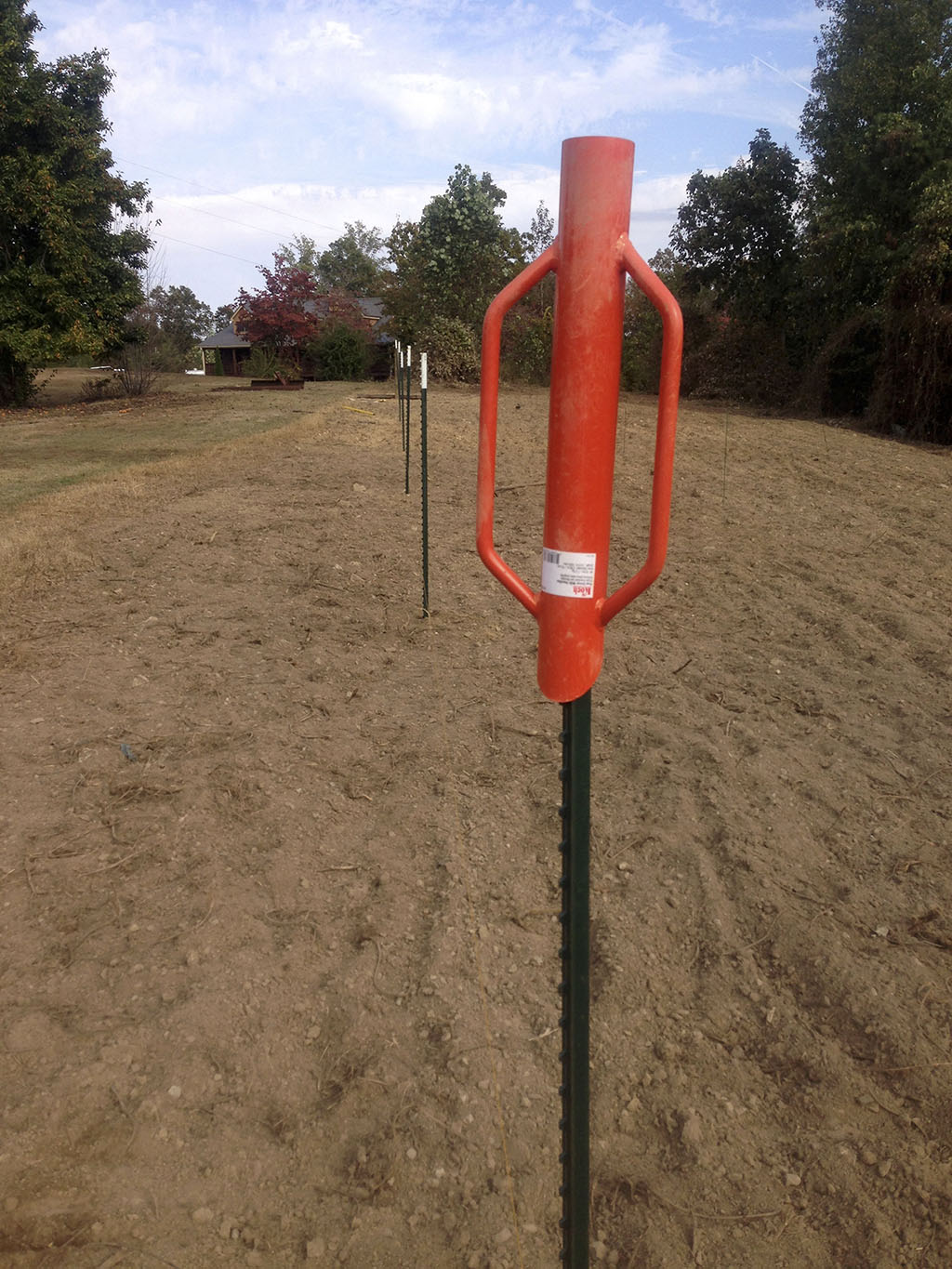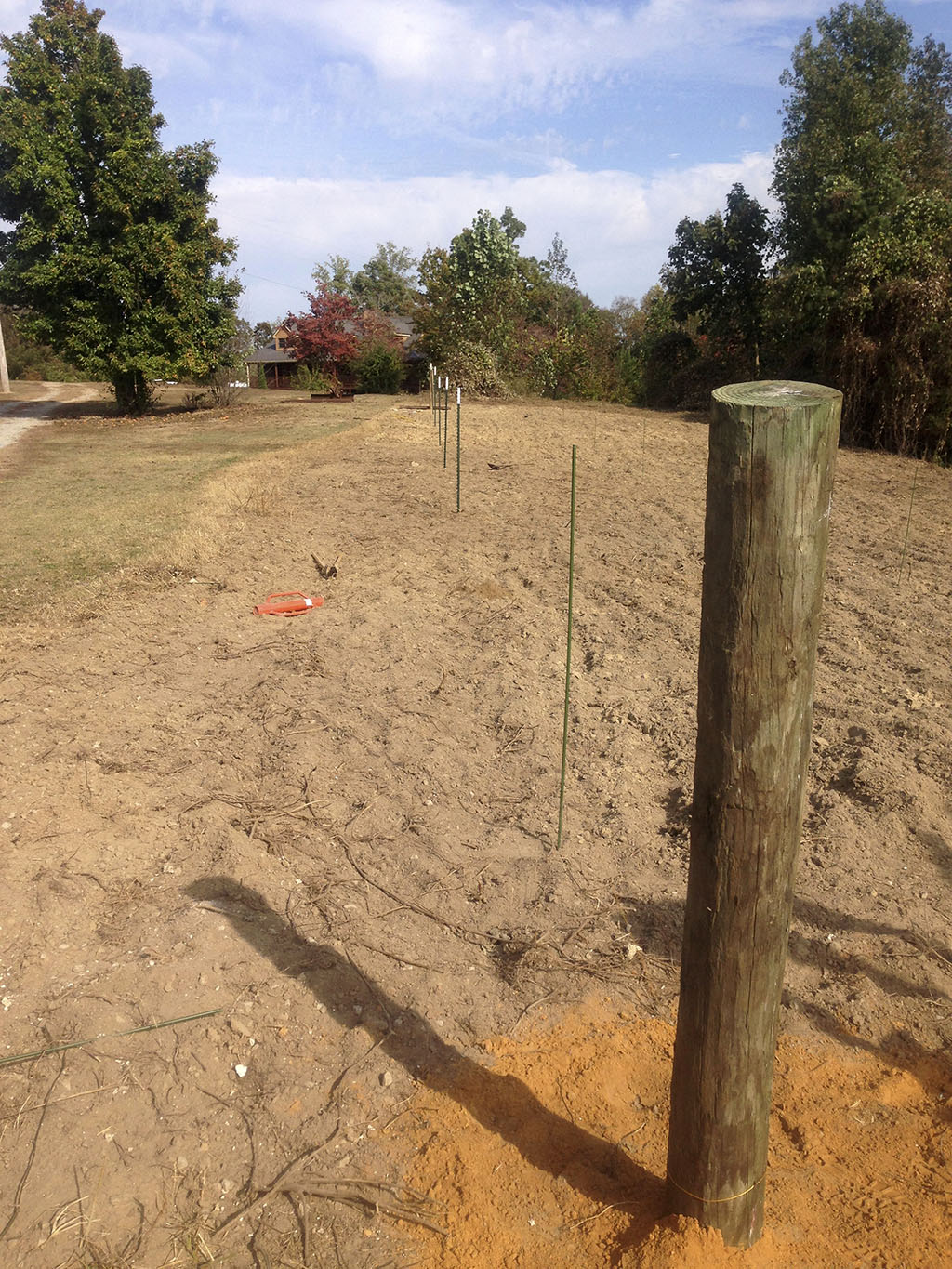 Using my new found post hole auger dug 8 holes for the 8″ end post. Decided I could get 4 rows in.