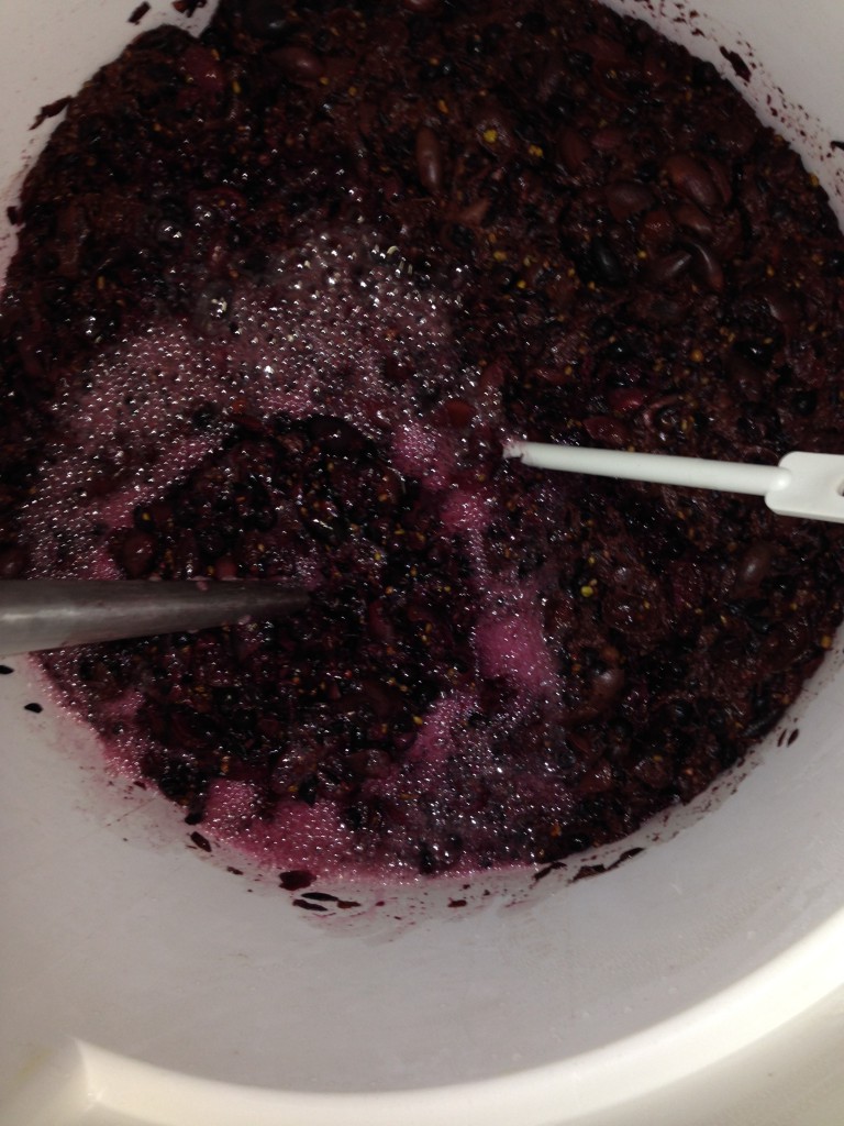 This is from my daily punch down. The CO2 from the yeast makes the skins float to the top. You need to push them down under the must (juice before its wine) at least twice a day. Keeps bacteria from setting in and ruining the wine (vinegar), it also helps to form the dark red wine color as this deep red/purple color comes from the skins. If you didn’t ferment on the skins, you would get a light colored Rose’ instead.