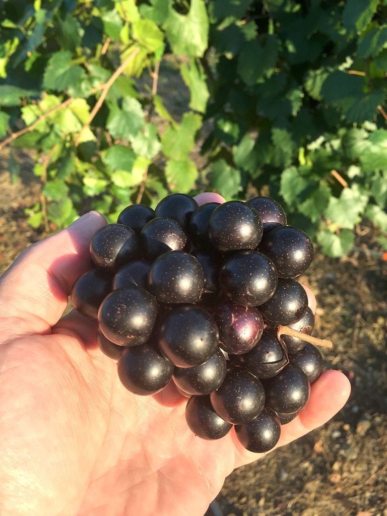 I taught Koda how to use the refractometer to test the sugar level. He checked several berries on various clusters. The brix was 15-17. We were only able to pick 65lbs this year. Not bad on these third year vines and after all the fruit the raccoons took. Next year should be a much better year.