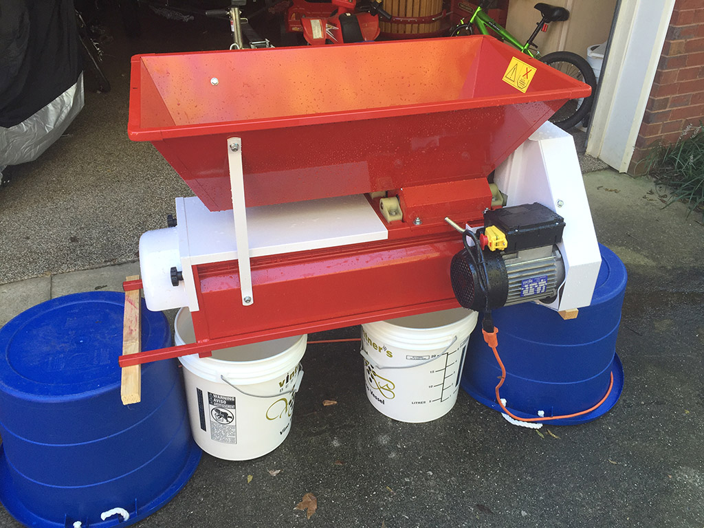Picked the muscadine late yesterday and by the time we got home it was just too late to crush. I had about 6 lbs of black beauty in the freezer. I pulled them out and put on top of the buckets to keep them cool over the night. By morning the frozen were defrosted and the noble was cool. I got this crusher last year on a great deal. Only have 65lbs to crush, but it would take a couple of hours to pull the grapes from the stems and crush, or 5-7min of work in the crusher and destemmer.
