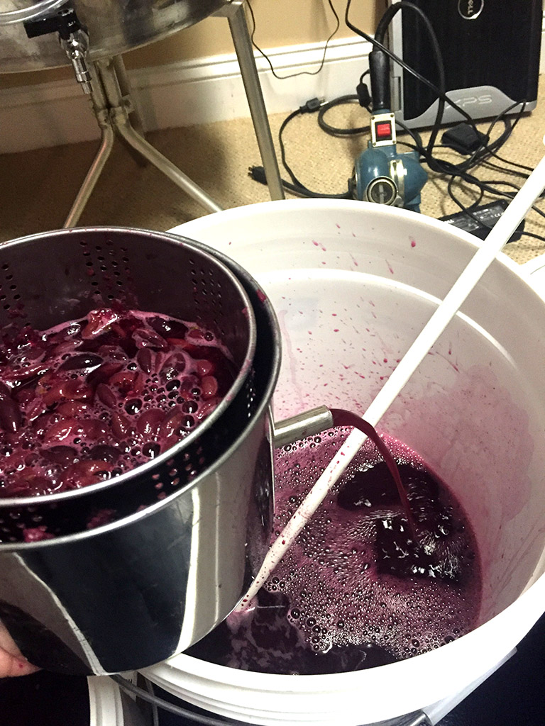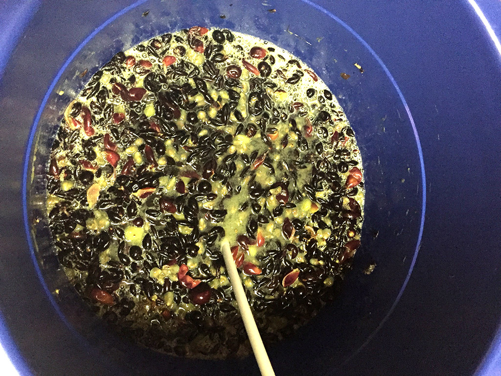3. Making adjustments: you can’t use the full volume of the must for sugar and TA adjustments. I use 6gal x .667 = 4gal to make these adjustments. The TA needs to be .60 – .70% for Dry Red or .65% – .80% for Sweet Red wine. I’m planning to make this batch dry, so I’ve decided to shoot for .65%. I use the Math Winery app on my iphone to help me with the adjustments, but there are many tools and adjustments calculators on the web. To get .40% to .65% TA on 4gal of must, I need to add 40 grams of Acid Blend. I mix this with 1/2 cup of distilled water and then mix in well to the must. I’m shooting for 12% ABV. I’m sure this will end up dry with a SG of .990 – .992. I’m starting with 1.058 and to get to 12% I need to get to S.G. 1.090. Start S.G = 1.090 and assuming I’ll end with .990, should get me to 12%. Using these numbers and the Math Winery app, I need to convert S.G to Brix. Starting Brix is 15 and goal is 23 (S.G. 1.090). I need to add 1.669kg or 3.65 lbs of sugar. To do this, I removed about two cups of must juice and heated to just before boiling in the microwave and then added the sugar and mixed well. I let cool a little until just warm and then mixed well into the must. I like adding some french oak beans at this time. Take 1-2oz of beans and add to 1/2 gal of water that has 1 campden tablet crushed and mixed well. Let the beans soak for 20min. Remove beans from water and add to must and mix well.