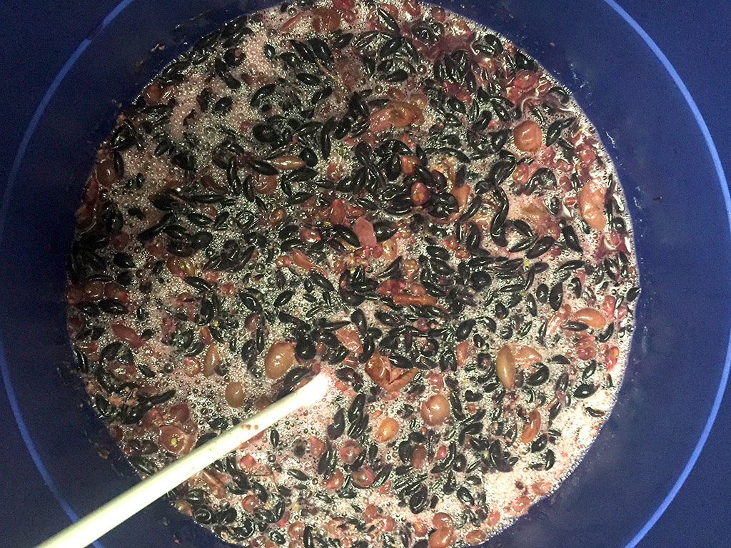 8. Adding more yeast nutrients after 1/3 depletion of brix: Yeast needs nutrients so they eat through the sugars at the right pace and don’t leave off odors. We started with a brix of 23 so when it gets down to 15 or S.G. of 1.065 we need to add more nutrients. This is usually within 48hrs after you started seeing bubbles from start of fermentation. This time we will add 4 grams of diammonium phosphate (DAP) yeast nutrient. Do this by adding 4g to 1/4 cup of water. Mix well until dissolved then mix well into must. By now the fermentation should be going very well and with each punchdown you should see lots of bubbles.