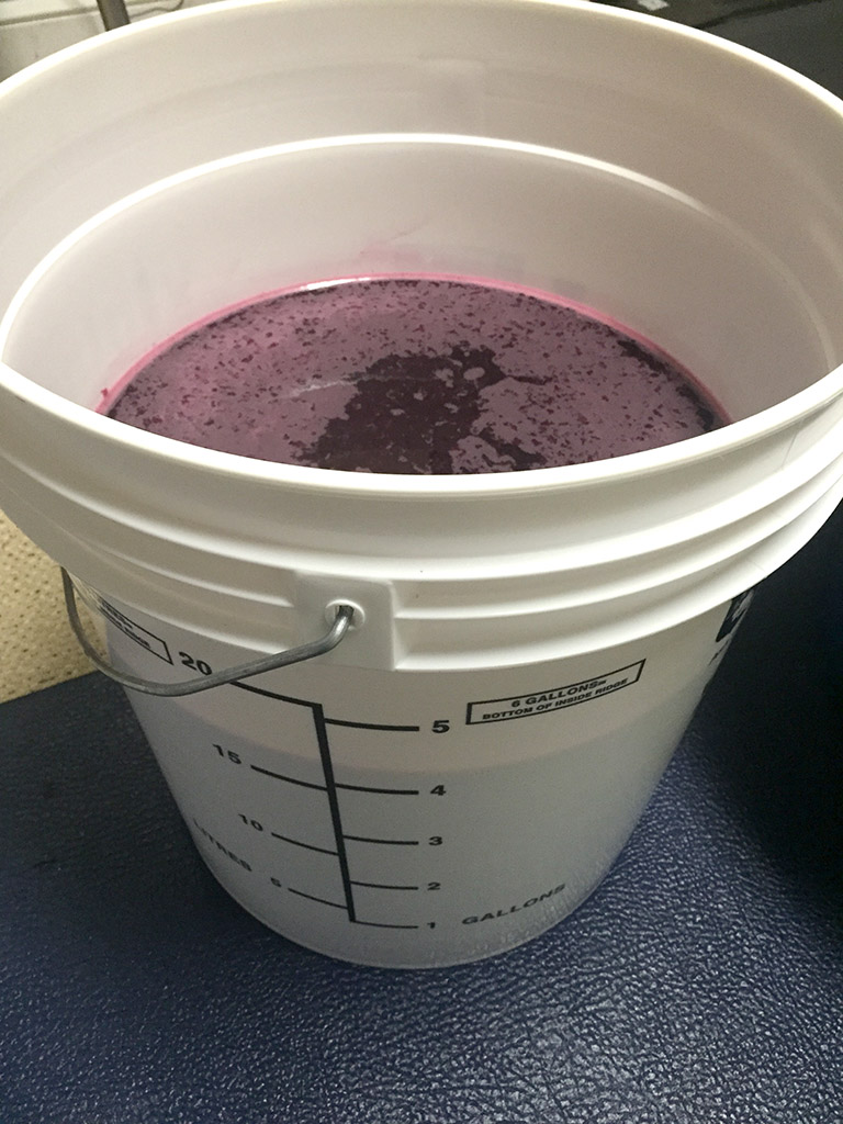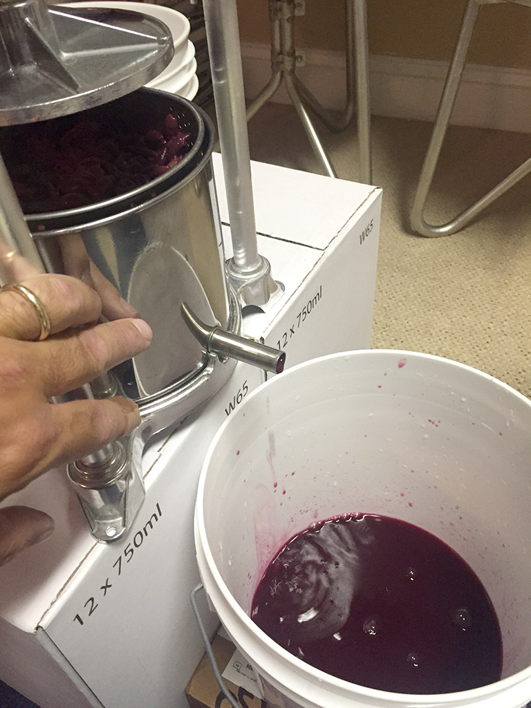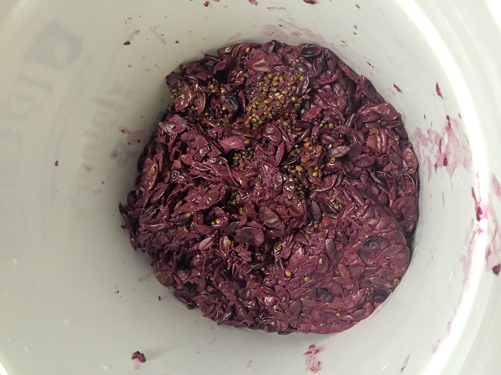 Press to get the juice out, but you don’t have to over press. Empty the skins and seeds into yet another bucket. They should be dry if pressed well.